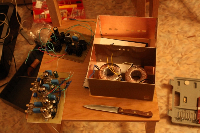 Пока удалось снизить уровень фона до маскирования шумом немой канавки. Но до референсного еще далеко:( Тут конструкцию надо серьезно менять. Выносить источник, использовать толстый металлический корпус. Может быть и лампы в экраны ставить. Пока желания такого нет. В планах попробовать на полевиках сделать. Там попроще в плане разделения источников, да и корпуса готовые есть. Но это в "долгом ящике". А пока было какое то плохое настроение, сделал конструкцию выходного дня. Разработал один из самых простых усилителей. На канал полторы лампы, 4 резистора и пару конденсаторов. Задача была - утилизировать "игрушечные" трансформаторы. Как ни странно, громкость получилась более чем достаточная, но вот из за трансформаторов низов нет. На фотографии видны эти микроскопические трансики. Если бы вместо них использовать трансы хотя бы от Ригонды, то можно было бы и мощность поднять, и низы бы появились... Но их в наличии нет. Да и не люблю я особо однотактники... Вот фото 1: А это 2:
