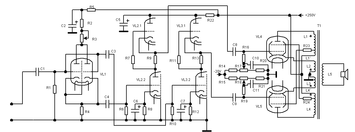 Комбинация ОС подобрана так, чтоб лампы работали в чистом классе А, без сеточных токов.