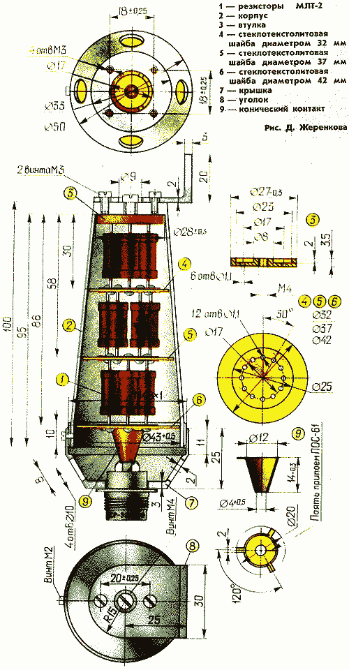 100 Ом. Выводы резисторов распаяны в отверстиях втулки 3 из