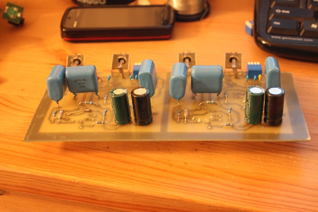 Ура, лед тронулся. Наконец мне собрали заказ и я благополучно его забрал  И сразу же собрал основную плату фонокорректора. Лампы пока установлены только для фото сессии. Надо сделать источник питания. Завтра займусь его изготавливанием. Если повезет, к концу праздников удастся завершить конструкцию Печатная плата сделано по фоторезистивной технологии. Немного накосячил с RCA, так как чертежа не было, а плата была изготовлена до получения заказа.