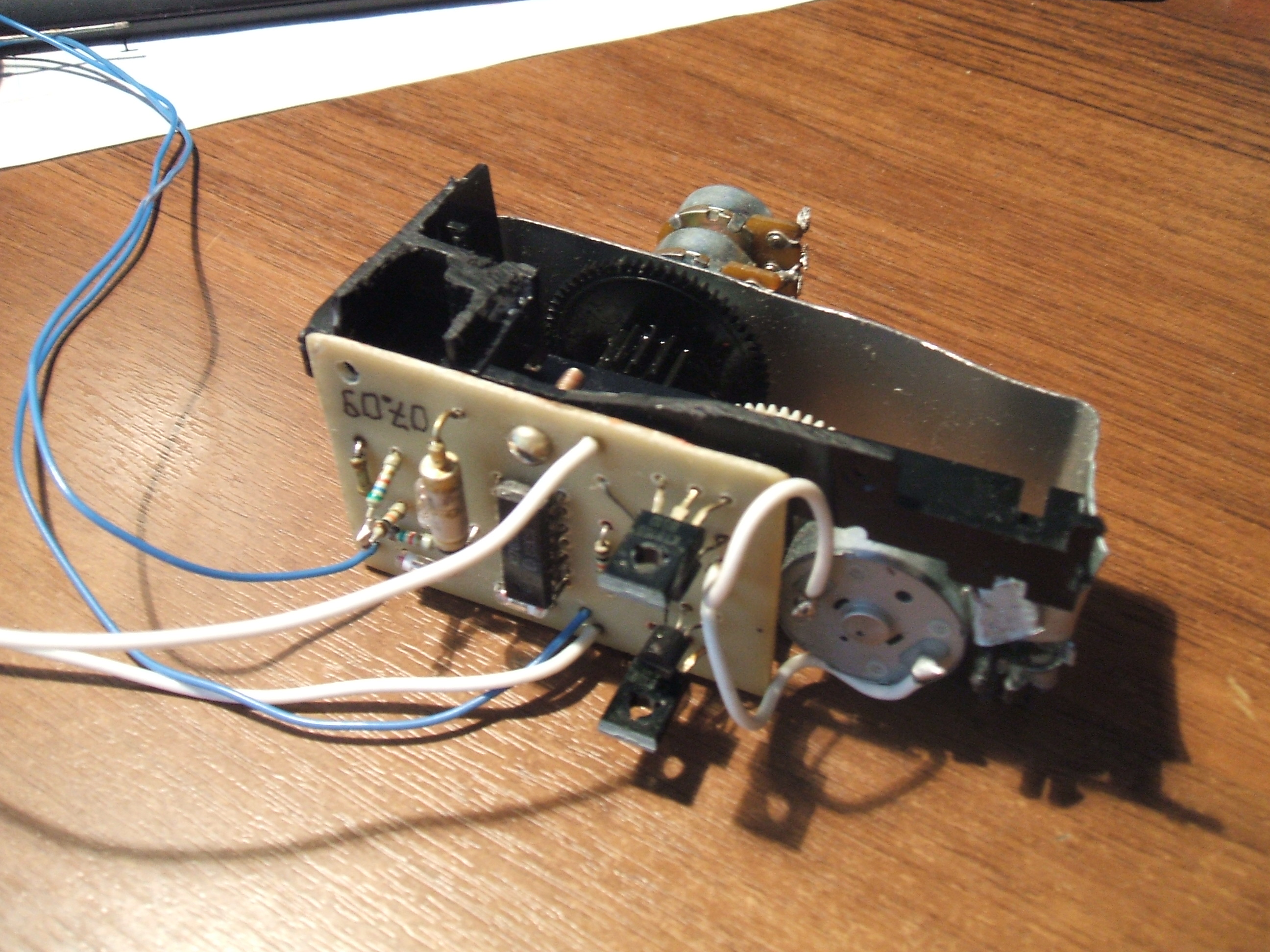 Вчера собрал электронный регулятор громкости, основанный на механическом перемещении вала переменного резистора. Основа редуктора - механизм для выдвижения лотка из CD привода. Там оказался приличный редуктор на 4-5 шестерен, доработал еще одной, с резистором. Ну и схема управления - двигатель управляется короткими импульсами, следующими с некоторым интервалом.