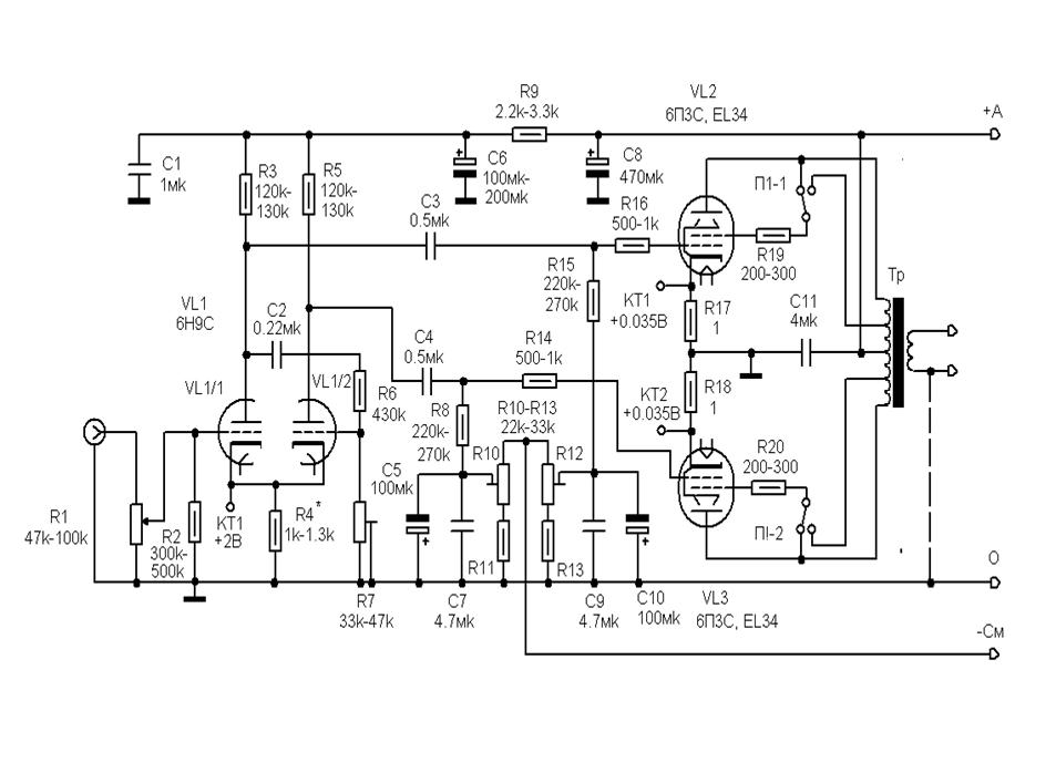 Короткий список ламп, могущих работать с этим трансом: 6С15П, 6С45П, 6Э5П, 6Э6П, 6Н6П (триоды параллельно), 6Н30П (каждый триод отдельно), 6П15П, 6П9, 6Ж52П, 6Ж43П и пр. Можете сами дополнить этот список.